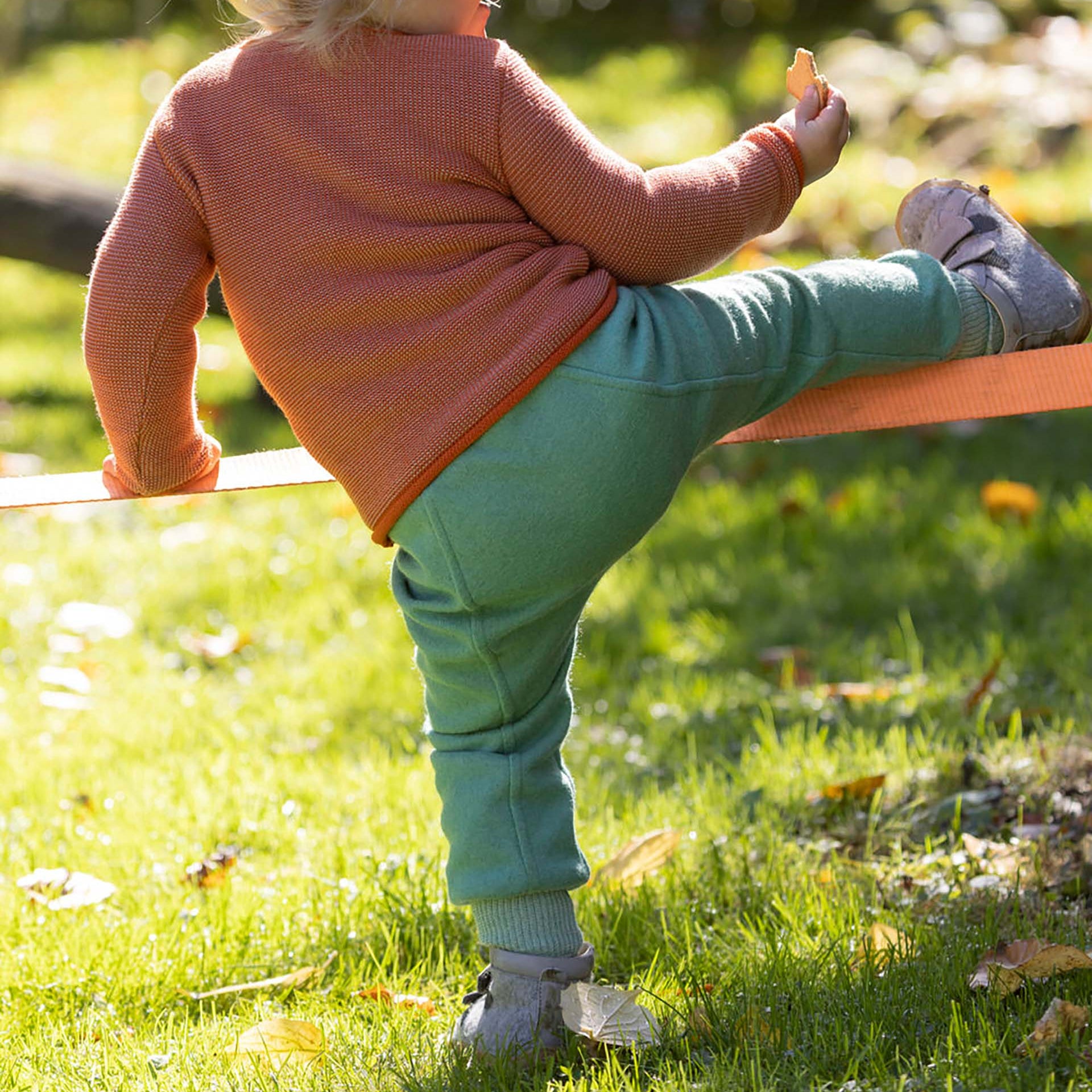 Die Disana Pumphose ist eine besonders bequeme Wollwalkhose für Babys und Kleinkinder – ideal für drinnen und draußen, besonders in Übergangszeiten. Gefertigt aus 100 % Bio‑Merinowolle (kbT, mulesingfrei) mit einem Flächengewicht von ca. 260 g/m² bietet sie natürlichen Temperaturausgleich, Wärme und angenehme Atmungsaktivität. Der Schnitt ist großzügig im Schritt und am Po ausgelegt, sodass auch mit Windelfreiheit noch Bewegungsfreiheit gegeben ist. Ein extra hoher Bund sorgt für sicheren, aber druckfreien Sitz am Bauch – die Beinabschlüsse sind mit langen Strickbündchen ausgestattet, damit die Hose oben bleibt, ohne zu rutschen. Dank des elastischen Wollwalk- und Bündchenmaterials wächst die Hose mit und bleibt über diverse Größen hinweg nutzbar. Sie ist unisex und eignet sich hervorragend als “Basisschicht” oder Alltags-Hose – ob allein oder unter einer Überhose getragen.