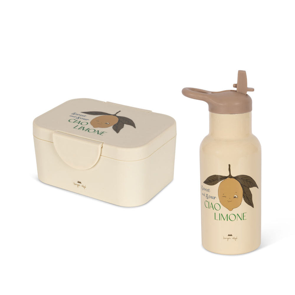 Das Lunch Box Set „Lemon“ von Konges Sløjd kombiniert zartes Design mit besonders durchdachten Details: Eine Brotdose mit flexiblem Trennsteg und passender Thermosflasche mit Strohhalm-Funktion im Deckel – beides ideal abgestimmt für den Kindergarten, Ausflug oder kleinen Lunch unterwegs.