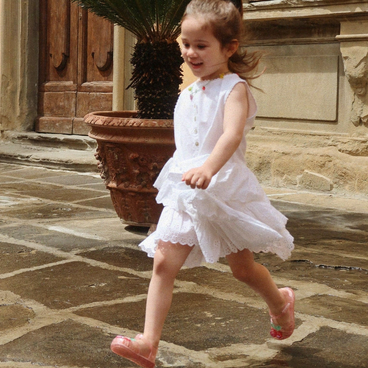 Konges Sløjd Lilo Sandalen Cherry sind verspielte Kinder-Badesandalen mit ikonischem Kirsch-Detail und funkelndem Glitzer-Element. Das wassergeeignete Material macht sie zum perfekten Begleiter für Strand, Pool und sommerliche Abenteuer, während der praktische Klettverschluss ein einfaches An- und Ausziehen ermöglicht – ideal für kleine Kinderhände.