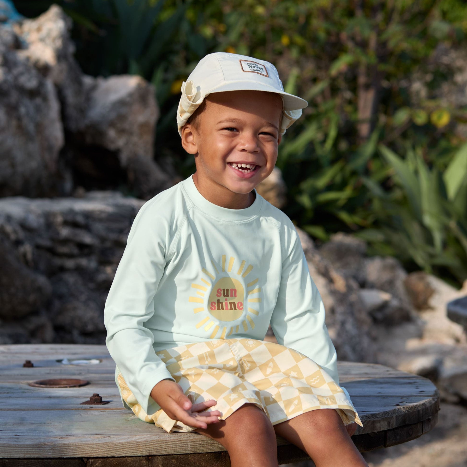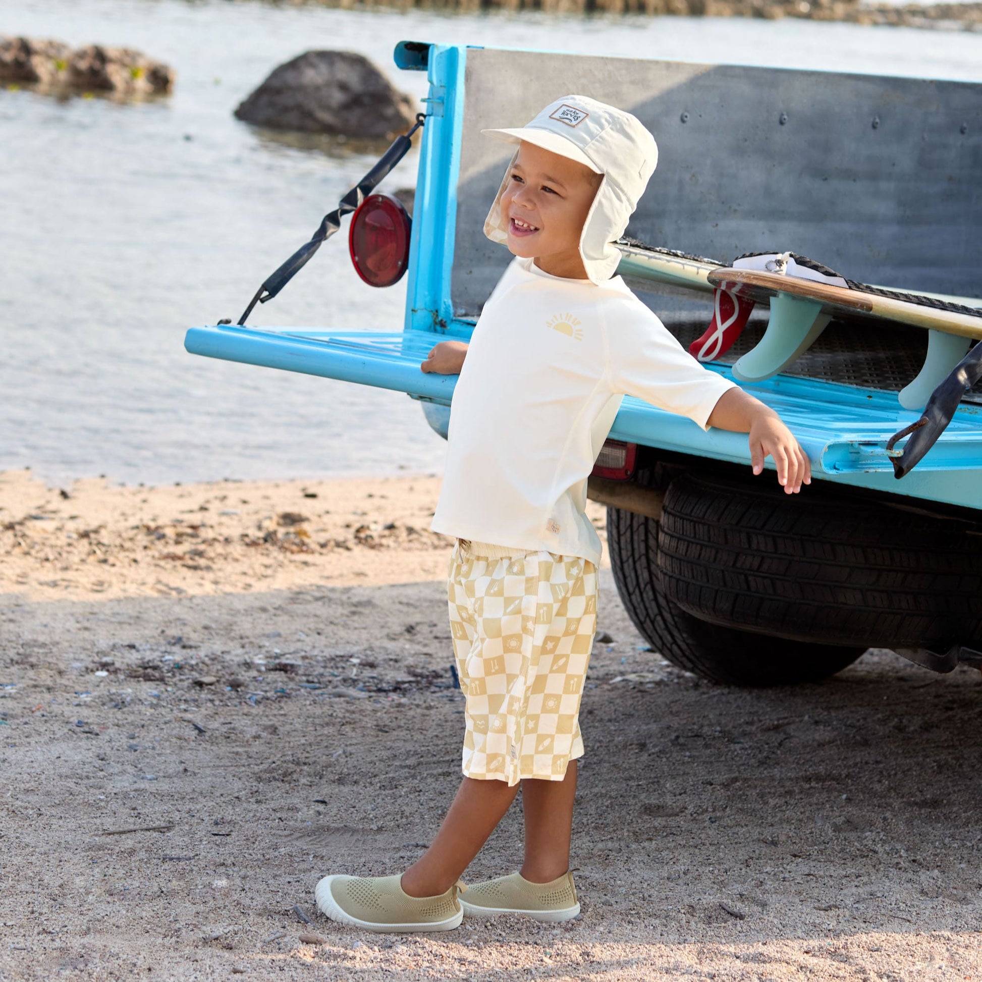 Die lange, gelb karierte UV Badehose für Kinder (3 - 6 Jahre) mit UV Schutz 80 sorgt für einen stylishen Surfer Look auf dem Badeausflug. Der elastische Bund und der Kordelzug garantieren ein angenehmes Tragegefühl.