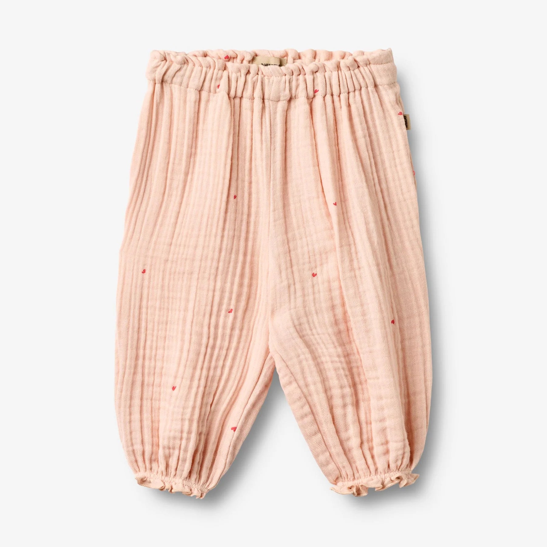 Verspielt, bequem und perfekt für den Alltag – die Petrine Trousers in Powder Hearts von Wheat sind eine charmante Hose für Kinder mit einem liebevollen Muster.